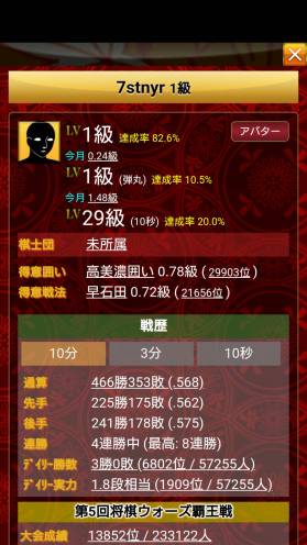 ・達成率が82.6%ということで、格上相手に7連勝等をすると「アマチュア初段」になる目標が達成できるという段階まできました。
